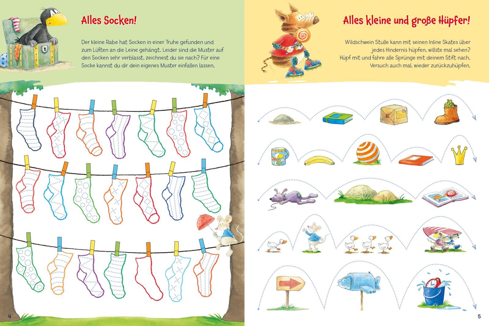 Nachfahren – wegwischen, Linien folgen – wegwischen ... ein tolles Beschäftigungsbuch vom kleinen Raben Socke für Kinder ab 4 Jahren.