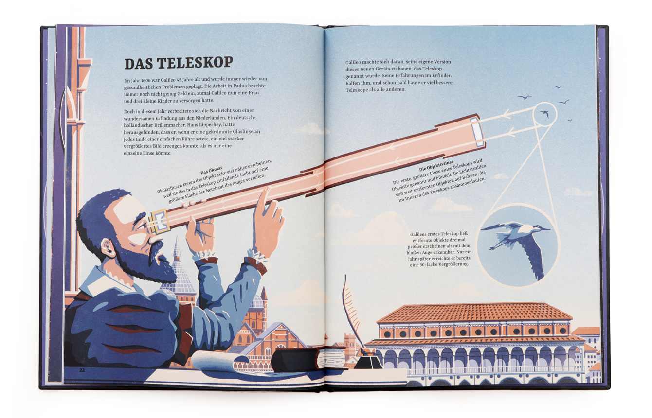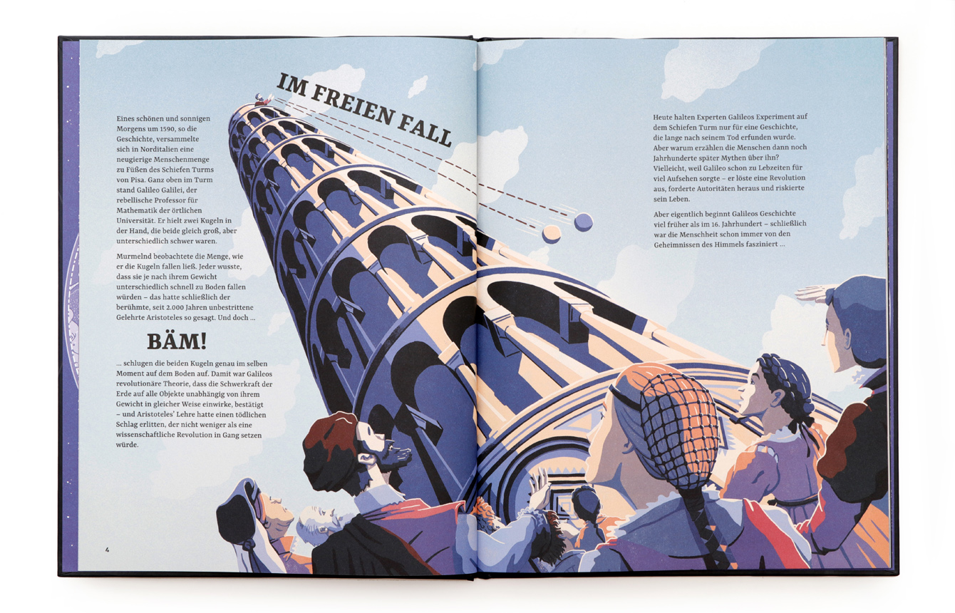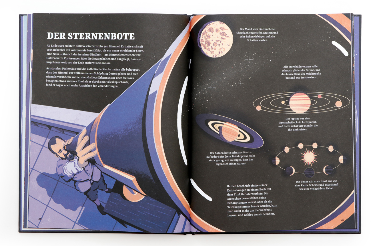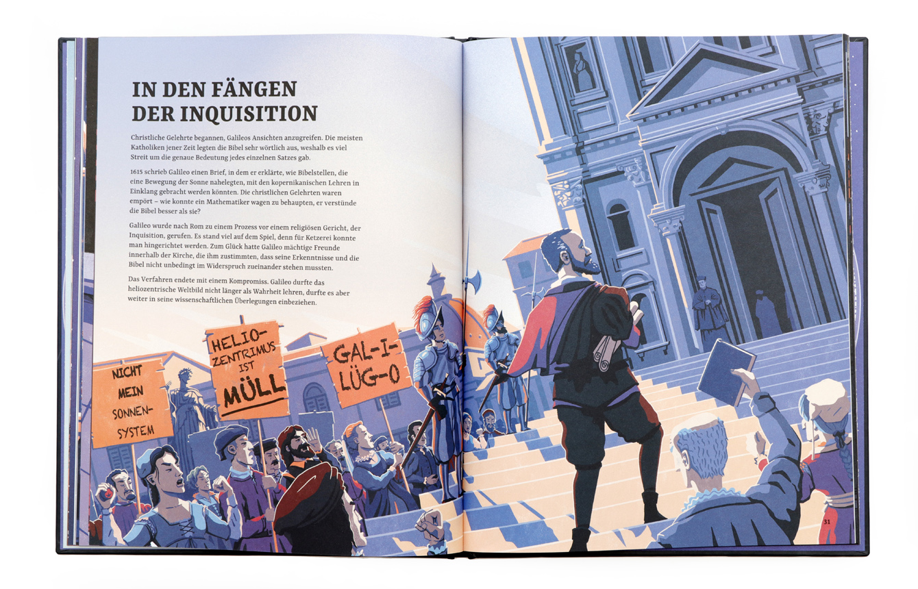 Ein neugieriger Sterndeuter, die mächtige Inquisition und der erbitterte Kampf um die Wahrheit… ein echter Krimi! Seit Jahrtausenden blickt die Menschheit fasziniert in den Sternenhimmel. Doch als ein junger Mann namens Galileo Galilei seine brillanten Entdeckungen über das Sonnensystem verkündete, erschütterte das die Grundfesten der damaligen Gesellschaft – einschließlich der allmächtigen Kirche. Dies ist die spannende Geschichte von Galileos Kampf um die Wahrheit und von der Geburtsstunde der modernen Wissenschaft. Die meist doppelseitigen und vollfarbigen Illustrationen ziehen den Betrachter förmlich in das Bild und kreieren einen außergewöhnlichen Spannungsbogen.