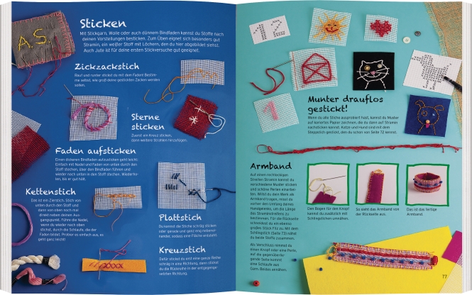 - Beschreibung Willkommen in Sabine Lohfs großer Textilwerkstatt! Wer der besten Freundin ein Kuschelkissen schenken oder Taschen und T-Shirts selbst gestalten möchte, ist hier genau richtig. Dieses Buch zeigt, was sich mit Stoff und Wolle alles machen lässt: bunte Girlanden, flauschige Schafe, Filzpantoffeln, Sockentiere, Pompon-Flamingos und vieles mehr. Wir können nicht nur nähen, sticken und häkeln, sondern auch filzen, weben, flechten, knüpfen, bedrucken oder batiken. Einfache Schritt-für-Schritt-Anleitungen, eine ausführliche Materialkunde und viele Tipps und Tricks rund um die verschiedenen Handarbeitstechniken verraten auch Anfängern, wie es geht. Altersempfehlung: ab 4 Jahre
