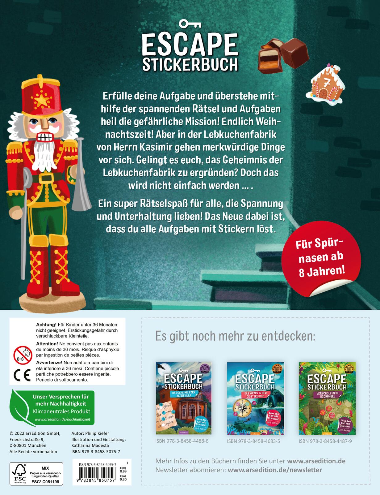 - Beschreibung Für alle Escape-Rätsel- und Stickerfans ab 8 Jahren!Erfülle deine Aufgabe und überstehe mithilfe der spannenden Rätsel und Aufgaben heil die gefährliche Mission! Endlich Weihnachtszeit! Aber in der Lebkuchenfabrik von Herrn Kasimir gehen merkwürdige Dinge vor sich. Gelingt es euch, das Geheimnis der Lebkuchenfabrik zu ergründen? Doch das wird nicht einfach werden ... . In diesem Heft versammeln sich viele verschiedene Rätseltypen, die mithilfe von Logik, Kombinationsgabe und einem schlauen Kopf gelöst werden müssen - ein super Rätselspaß für alle, die Spannung und Unterhaltung lieben! Das Neue dabei ist, dass du alle Aufgaben mit Stickern löst. Abwechslungsreiche Rätsel: Suchrätsel, Puzzles, Codes, Labyrinthe und Logikrätsel, Kombinationsaufgaben u. v. m., altersgerecht entwickelt Mit Lösungsstickern: Jedes Rätsel wird mit Stickern gelöst. So wird das bekannte Escape-Konzept um eine neue, beliebte Kompenente ergänzt. Alleine oder mit mehreren spielbar: Den Escape-Room-Fall kann man alleine lösen oder zusammen mit Freunden oder der Familie. Ideal als Geschenk: Ein tolles Mitbringsel für alle rätselbegeisterten Kinder ab 8. Dieses Escape-Room-Buch macht nicht nur allen Rätselfans Spaß, sondern fördert auch noch das logische Denken und die Konzentration der Kinder! Eine sinnvolle Beschäftigung, die auch unterwegs oder im Urlaub richtig Laune macht. Altersempfehlung: ab 8 Jahre Achtung! Nicht für Kinder unter 36 Monaten geeignet. Erstickungsgefahr durch verschluckbare Kleinteile.