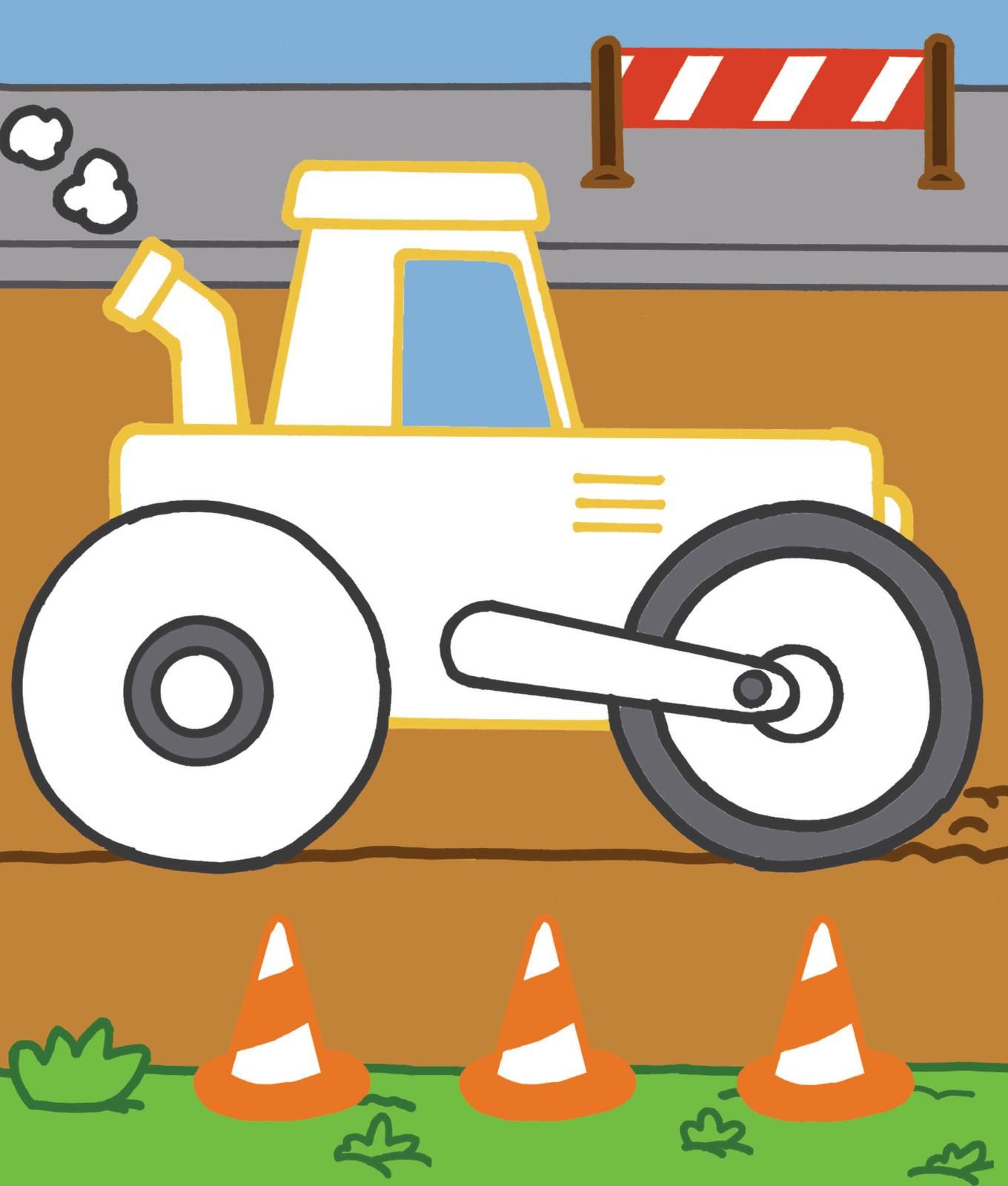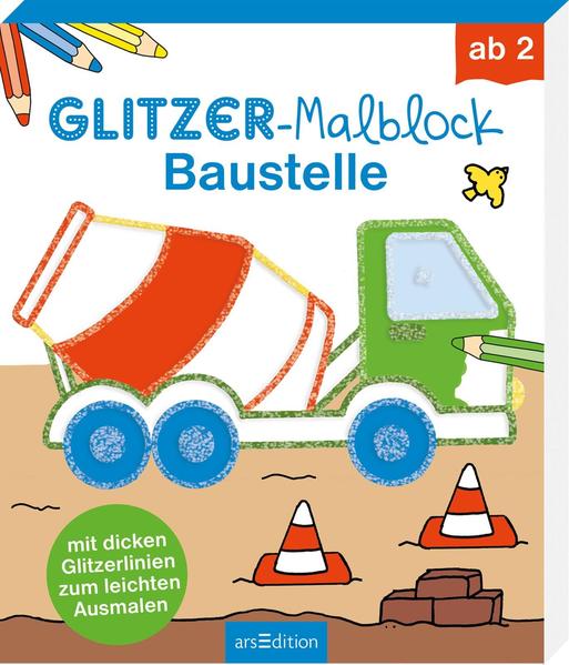 In diesem Block finden sich viele bunte Baustellenmotive zum Ausmalen. Bagger, Dampfwalze, Kran und Betonmischer lassen Kinderaugen leuchten. Die breiten Glitzerlinien auf den Ausmalseiten sehen nicht nur schön aus, sondern helfen dabei, nicht über den Rand zu malen.