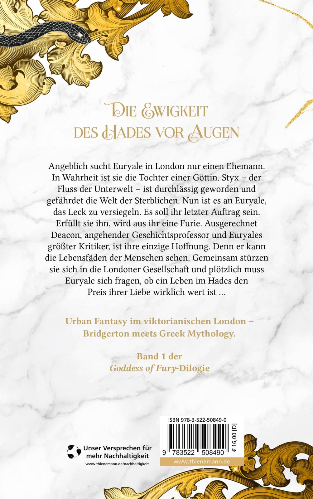 Styx – der Fluss der Unterwelt – ist durchlässig geworden und gefährdet die Welt der Sterblichen. Nun ist es an Euryale, das Leck zu versiegeln. Es soll ihr letzter Auftrag sein. Erfüllt sie ihn, wird aus ihr eine Furie. Ausgerechnet Deacon, angehender Geschichtsprofessor und Euryales größter Kritiker, ist ihre einzige Hoffnung. Denn er kann die Lebensfäden der Menschen sehen. Gemeinsam stürzen sie sich in die Londoner Gesellschaft und plötzlich muss Euryale sich fragen, ob ein Leben im Hades den Preis ihrer Liebe wirklich wert ist …