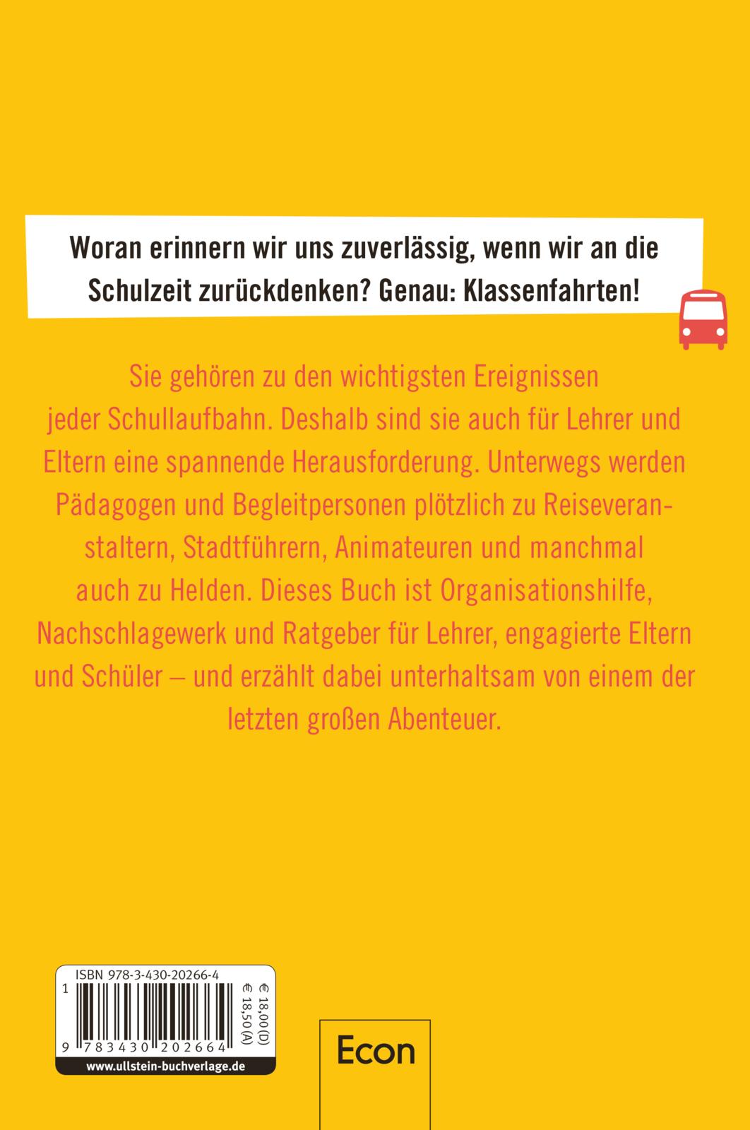 Woran erinnern wir uns alle zuverlässig, wenn wir an die eigene Schulzeit zurückdenken? Klassen-, Stufen- und Kursfahrten gehören zu den wichtigsten Ereignissen jeder Schullaufbahn. Das Projekt Klassenfahrt bedarf aufmerksamer Planung und Durchführung. Eine Klassenfahrt fördert auch die zunehmend wichtiger werdende Sozialkompetenz, denn niemals sonst ist die Zeit der Schüler so intensiv, ohne den üblichen 45-Minuten-Rhythmus und ohne Lehrplandruck. Lehrer und begleitende Eltern werden schon in der Vorbereitung zu Reiseveranstaltern, Stadtführern und Pädagogen gleichzeitig. Dieses Buch ist Organisationshilfe, Nachschlagewerk und Ratgeber für alle engagierten Lehrer und natürlich für Eltern.