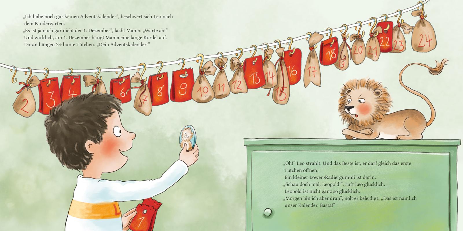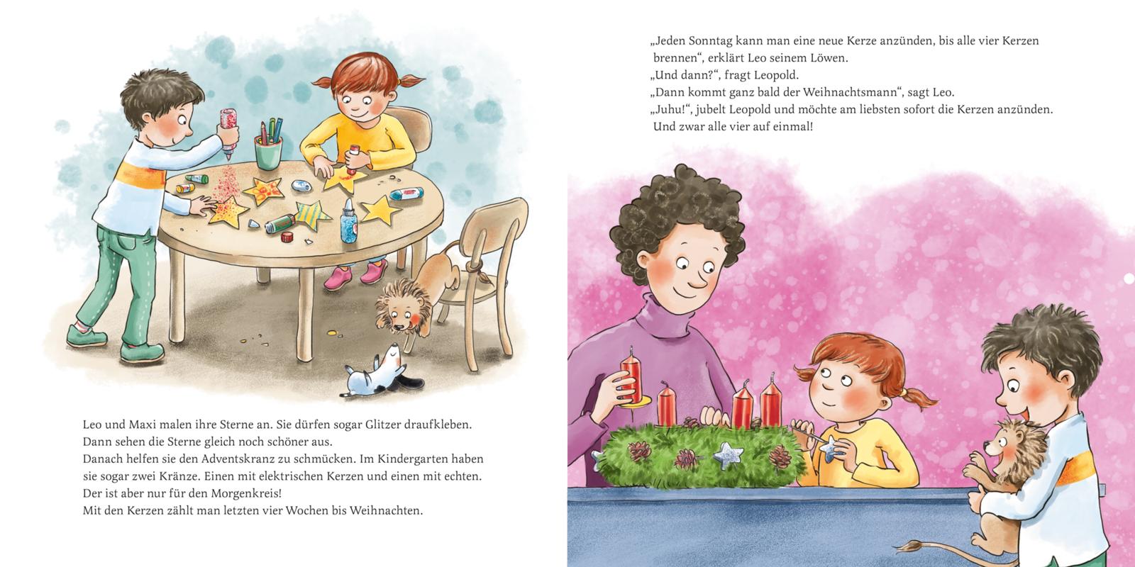 Leo und Leopold können es kaum erwarten: Bald ist Weihnachten! Auch im Kindergarten dreht sich alles um das Fest. Es wird gebastelt, geschmückt, gesungen und ein Krippenspiel geübt. Es duftet nach Kerzen, Tannenzweigen und selbst gebackenen Plätzchen. Natürlich gibt es einen Adventskranz und Adventskalender, der Nikolaus bringt etwas, sie machen einen Ausflug auf den Weihnachtsmarkt und vergessen die Vögel im Garten nicht. Und am Ende feiern alle zusammen ein großes, wunderbares Weihnachtsfest!
