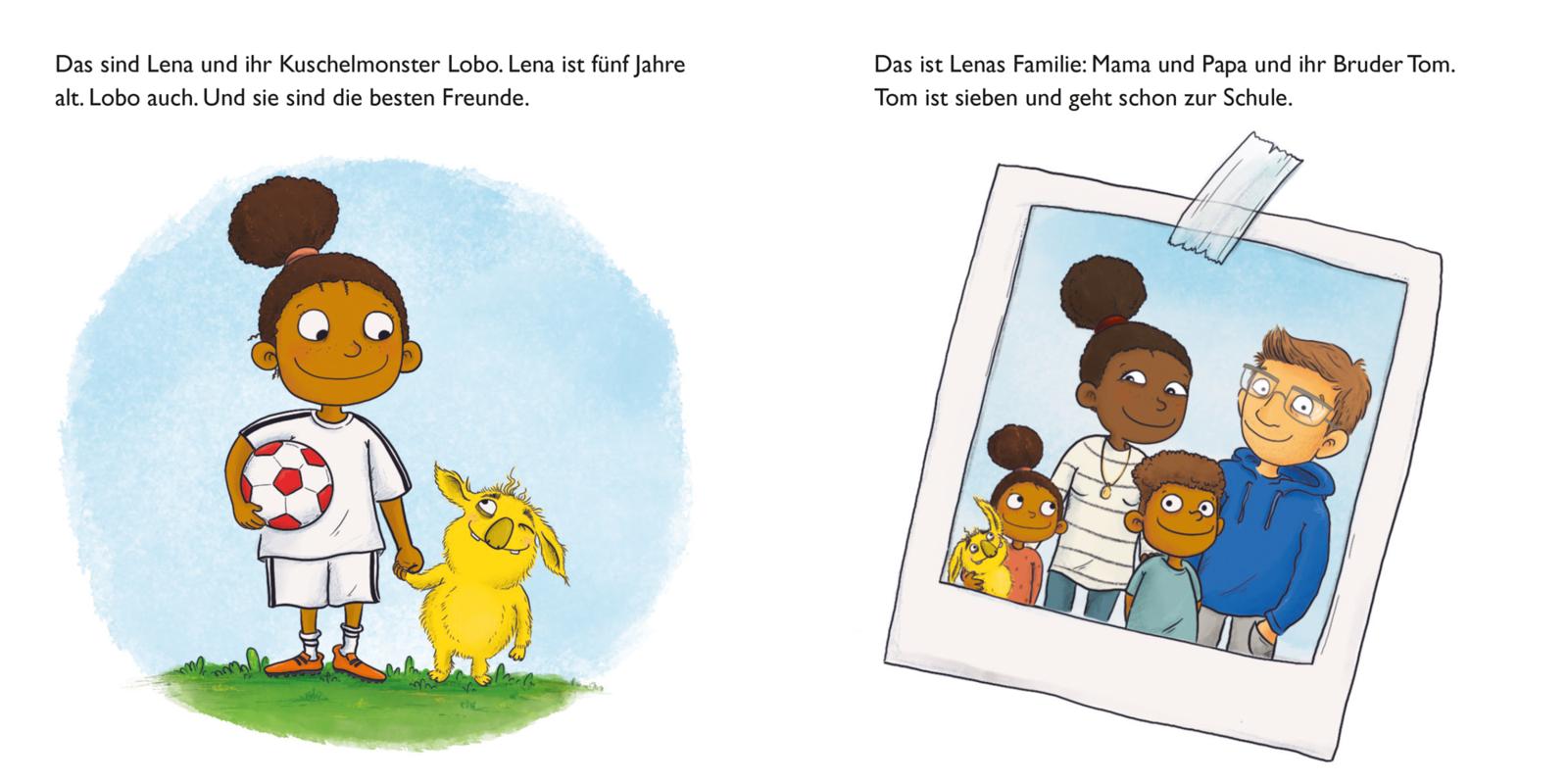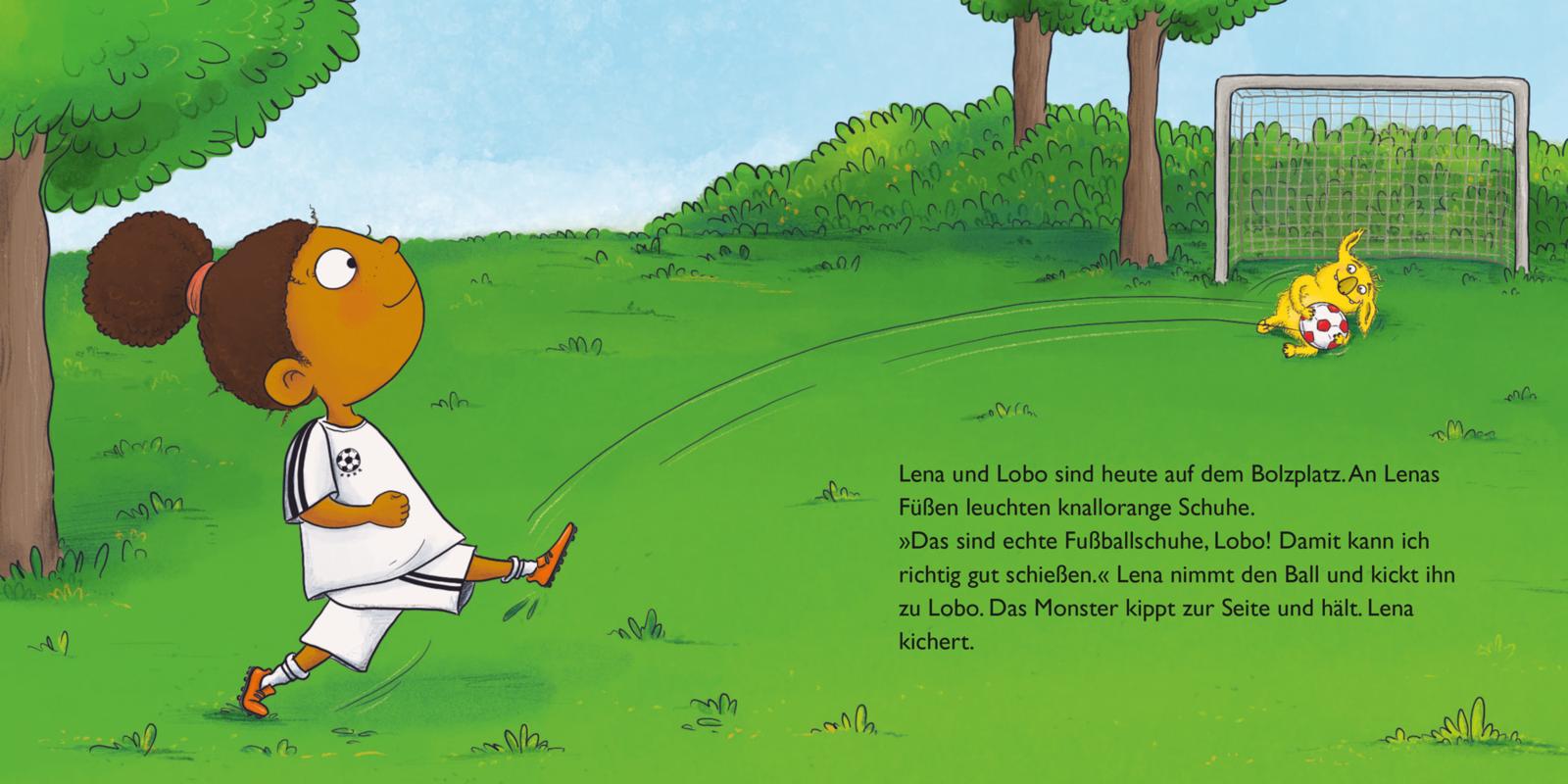 Heute treffen sich Lena und ihr Kuschelmonster Lobo mit Nils und Matti auf dem Bolzplatz. Lena will ihre neuen Fußballschuhe ausprobieren. Sie trifft den Ball genau in der Mitte. Wie eine Rakete fliegt er los – und übers Tor hinweg ins Gebüsch. Na toll, das Spiel ist erst mal aus! Ob sie den Ball wohl wiederfinden werden?