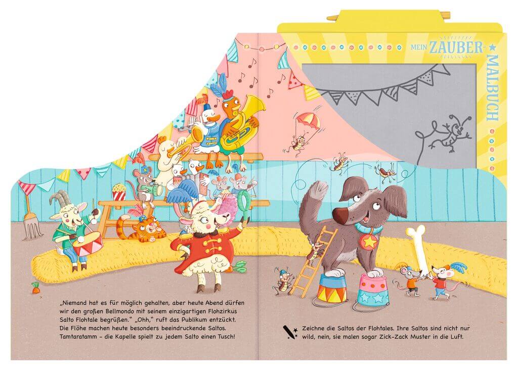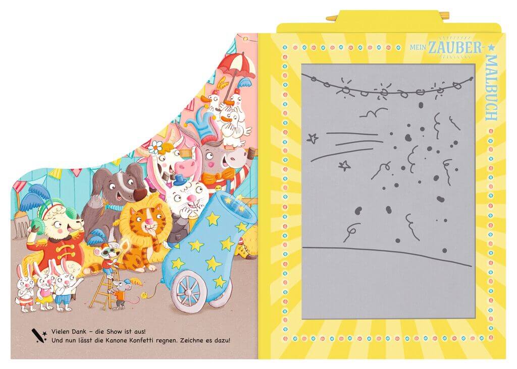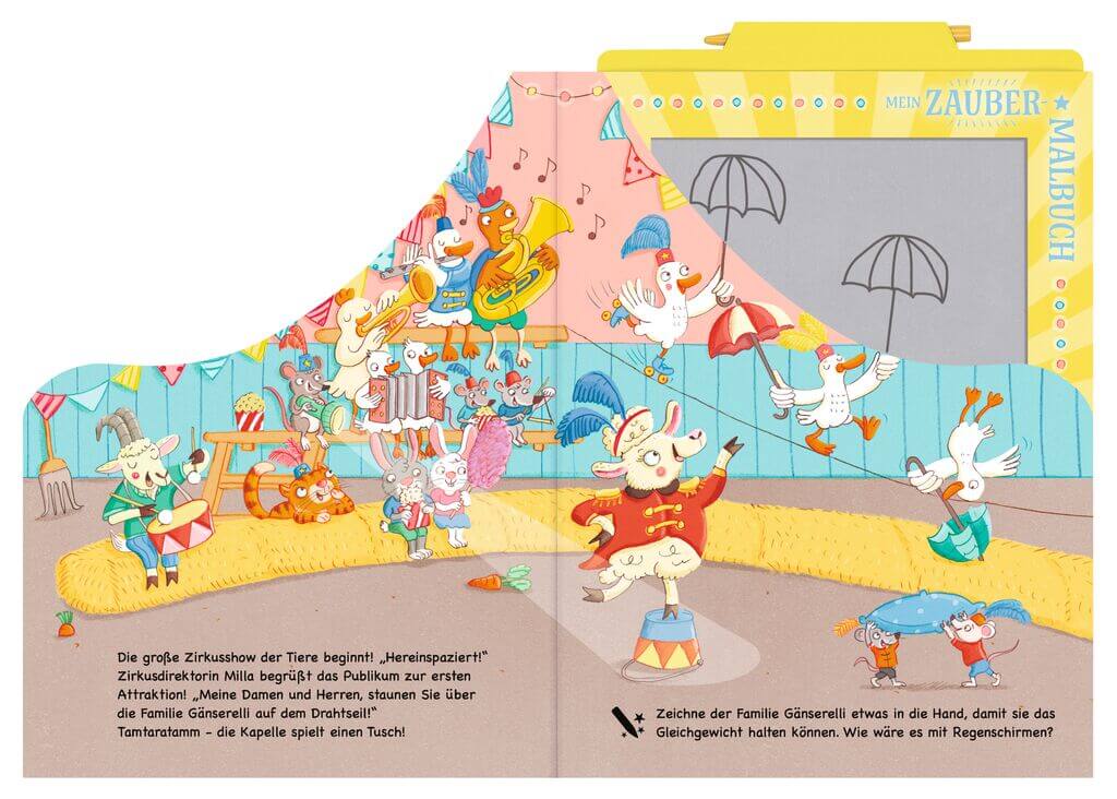 Einzigartige Verbindung von Pappbuch und Zaubertafel. Das Schaf Milla präsentiert den Zirkus der Tiere. Mit was balancieren die Gänse denn da? Und wie viele Hüte passen auf den Kopf desesels? Das alles können die Kinder auf der Zaubertafel direkt passend dazumalen.