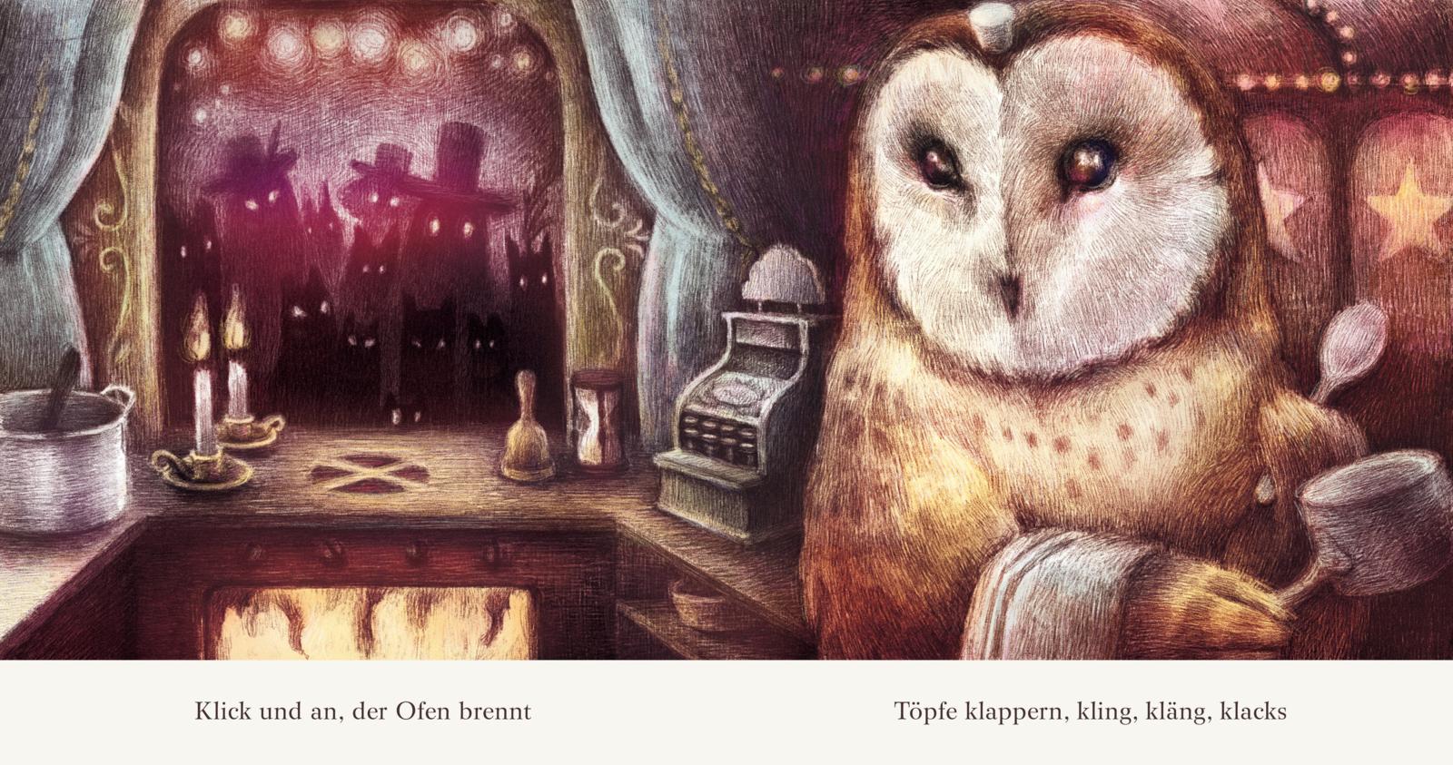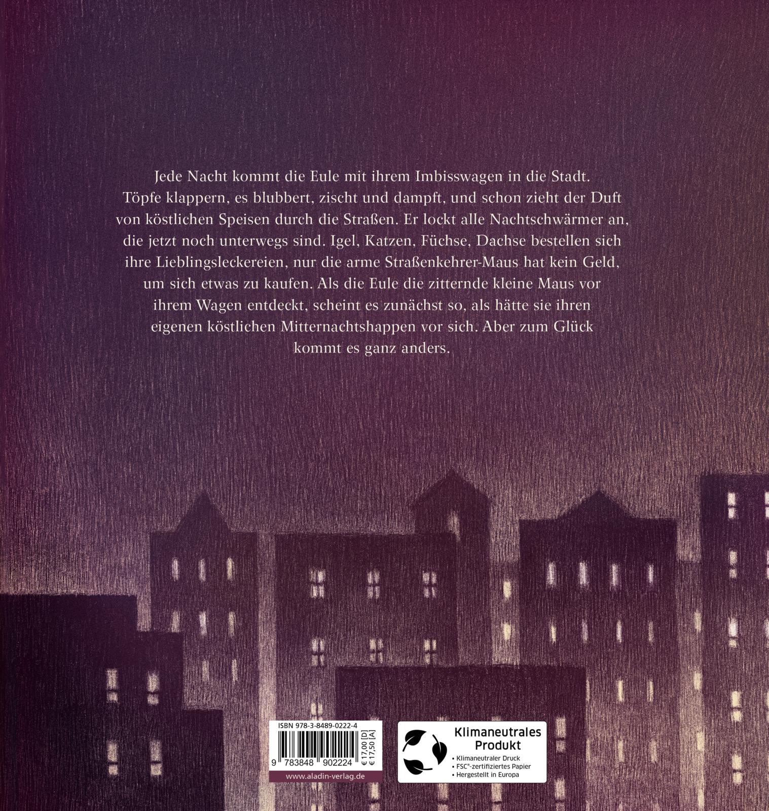 Jede Nacht kommt die Eule mit ihrem Imbisswagen in die Stadt, begleitet vom Klappern, Blubbern, Zischen und Dampfen ihrer Töpfe. Der Duft von köstlichen Speisen lockt alle Nachtschwärmer an, darunter Igel, Katzen, Füchse und Dachse, die sich ihre Lieblingsleckereien bestellen. Nur die arme Straßenkehrer-Maus hat kein Geld, um sich etwas zu kaufen. Als die Eule die zitternde Maus entdeckt, scheint es zunächst so, als hätte sie ihren eigenen köstlichen Mitternachtshappen vor sich. Aber es kommt ganz anders ...