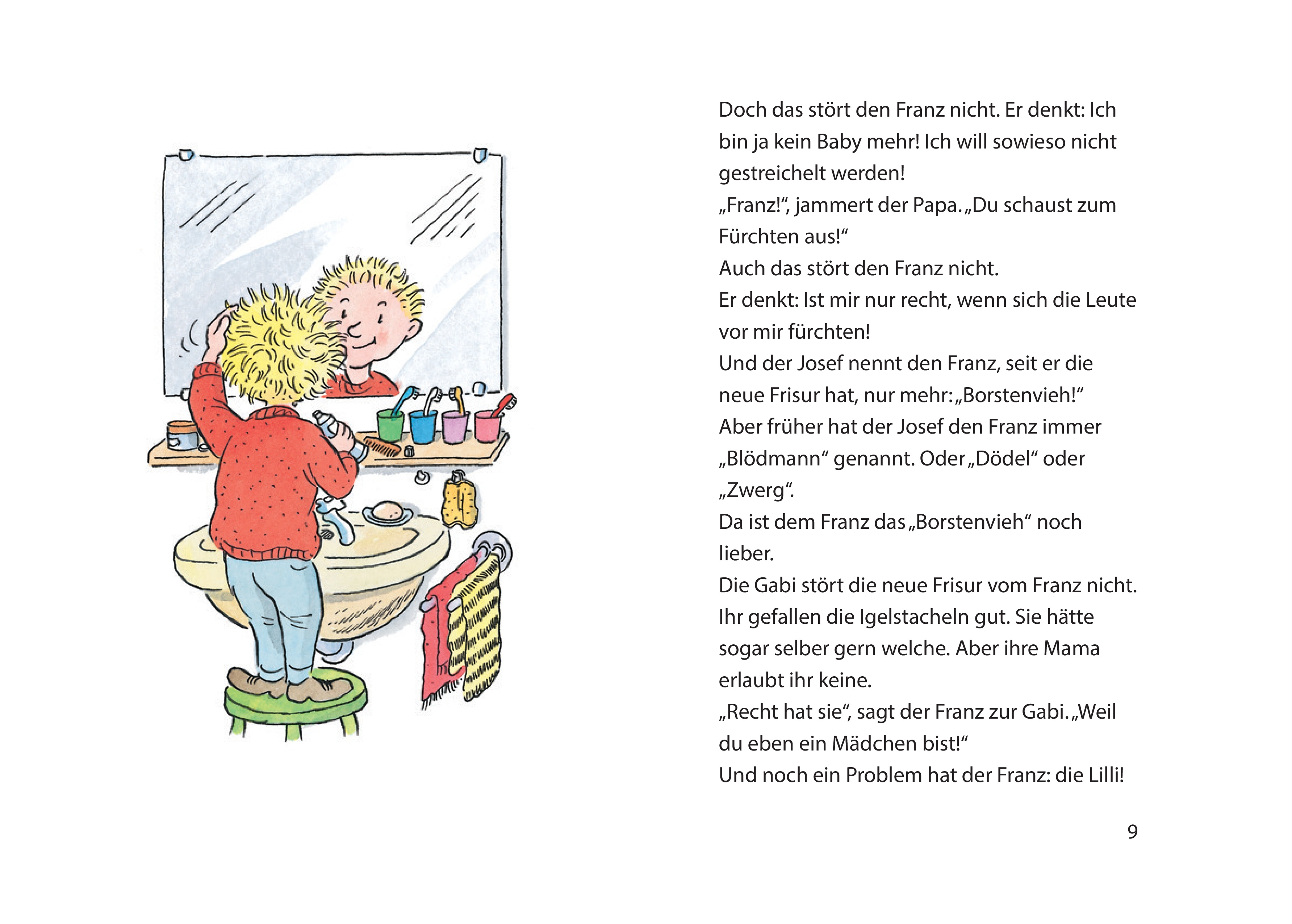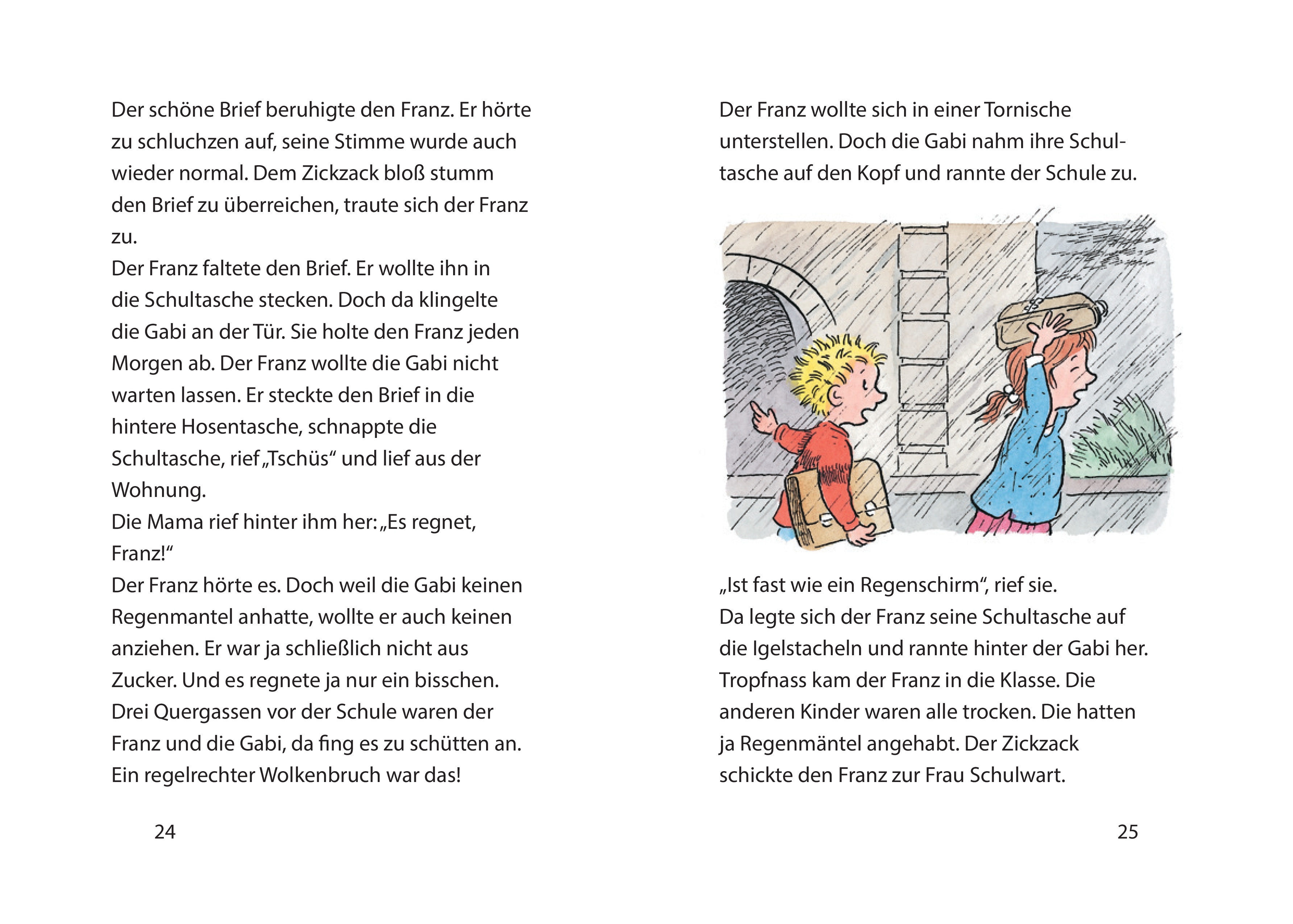 Lustige Schulgeschichten mit dem Franz. Wie ein Mädchen schaut der Franz zum Glück schon lange nicht mehr aus. Aber seine Stimme, die ist immer noch ganz hoch und piepsig. Und als er dem Lehrer Zickzack eines Tages erklären will, dass sein Rechenaufgabenheft ins Wasser gefallen ist und die Entschuldigung vom Papa dazu, kann der Franz vor Aufregung nicht mal mehr piepsen. Da hat die Gabi eine Idee. Die Lesestarter von Oetinger motivieren auch leseschwache Kinder zum Lesen. Wie? Mit bekannten Autoren, starken Charakteren und populären Themen, die Kinder im Alter von fünf bis zehn Jahren begeistern. Und mit vielen Bildern, Spielen und Leserätseln. Lustig, frech und typisch Franz! Mit ihm macht Lesenlernen einfach richtig Spaß.