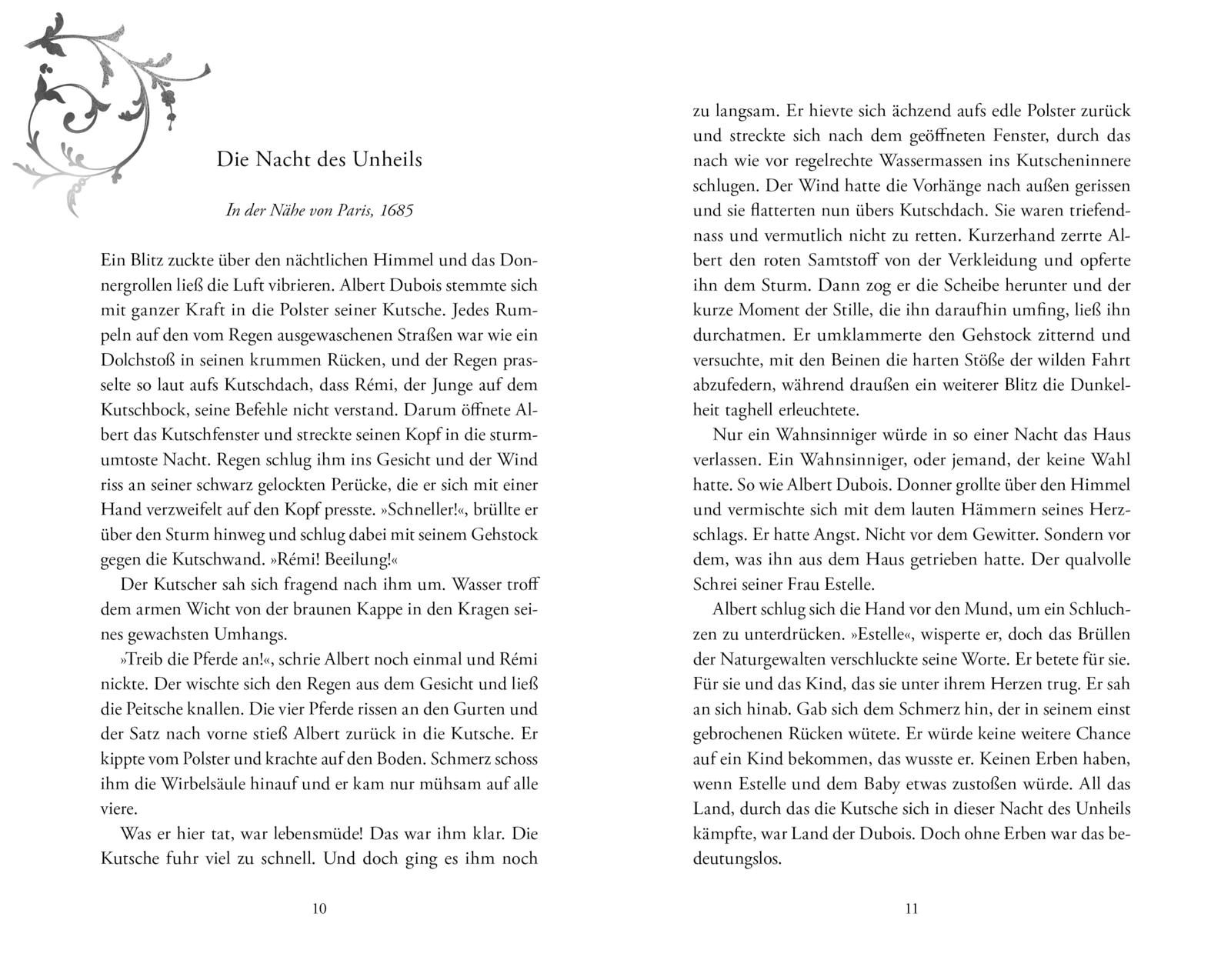 Für Sophie Dubois und ihre Familie zählt nur eines: Wann immer auf dem Pergament der Schuld wie von Zauberhand eine neue Aufgabe erscheint, gilt es, durch die Zeit zu reisen und den Auftrag zu erfüllen – bis Sophies Bruder eines Tages verschwindet. Als sie sich kurzerhand selbst in die Vergangenheit begibt, landet Sophie mitten im Paris von 1688 und am Hofe des Palasts von Versailles. Der entpuppt sich nicht nur als gefährlich für eine junge Frau, sondern auch ihr mysteriöser Auftraggeber scheint ihr nicht zu trauen. Ungefragt stellt er ihr einen Fremden zur Seite: den geheimnisvollen Valentin Delacroix. Dabei sind die Gefühle, die er in ihr weckt, alles andere als hilfreich …