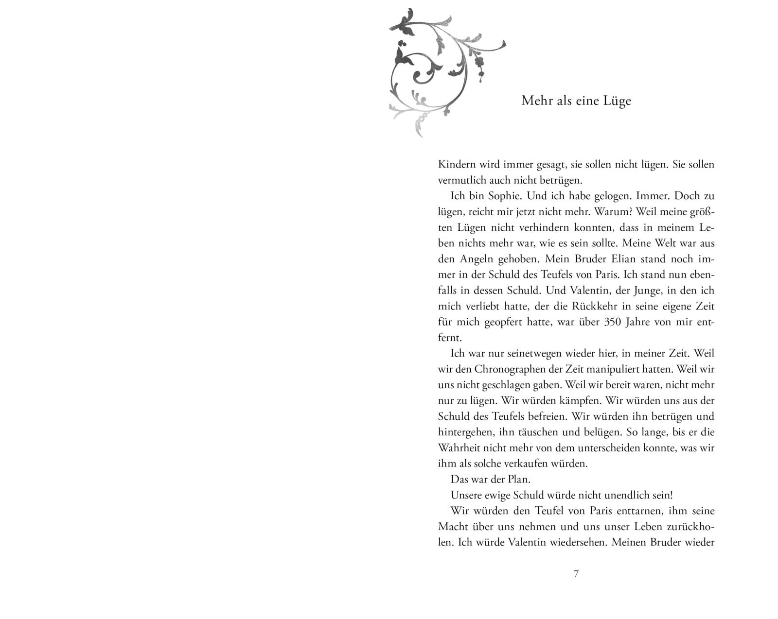 Statt in der Vergangenheit steckt Sophie nun in der Gegenwart fest – und das ohne ihren Bruder Elian und ihre große Liebe Valentin, die nach wie vor im Paris von 1688 gefangen sind. Nur eine Sache ist dabei absolut sicher: Der Teufel von Paris führt nichts Gutes im Schilde! Er will Valentin noch weiter in der Zeit zurückschicken, um die Ermordung seiner Familie ungeschehen zu machen. Sophie versucht mit aller Kraft, ihre zwei liebsten Menschen zu retten, bevor sie sie auf ewig verliert ...