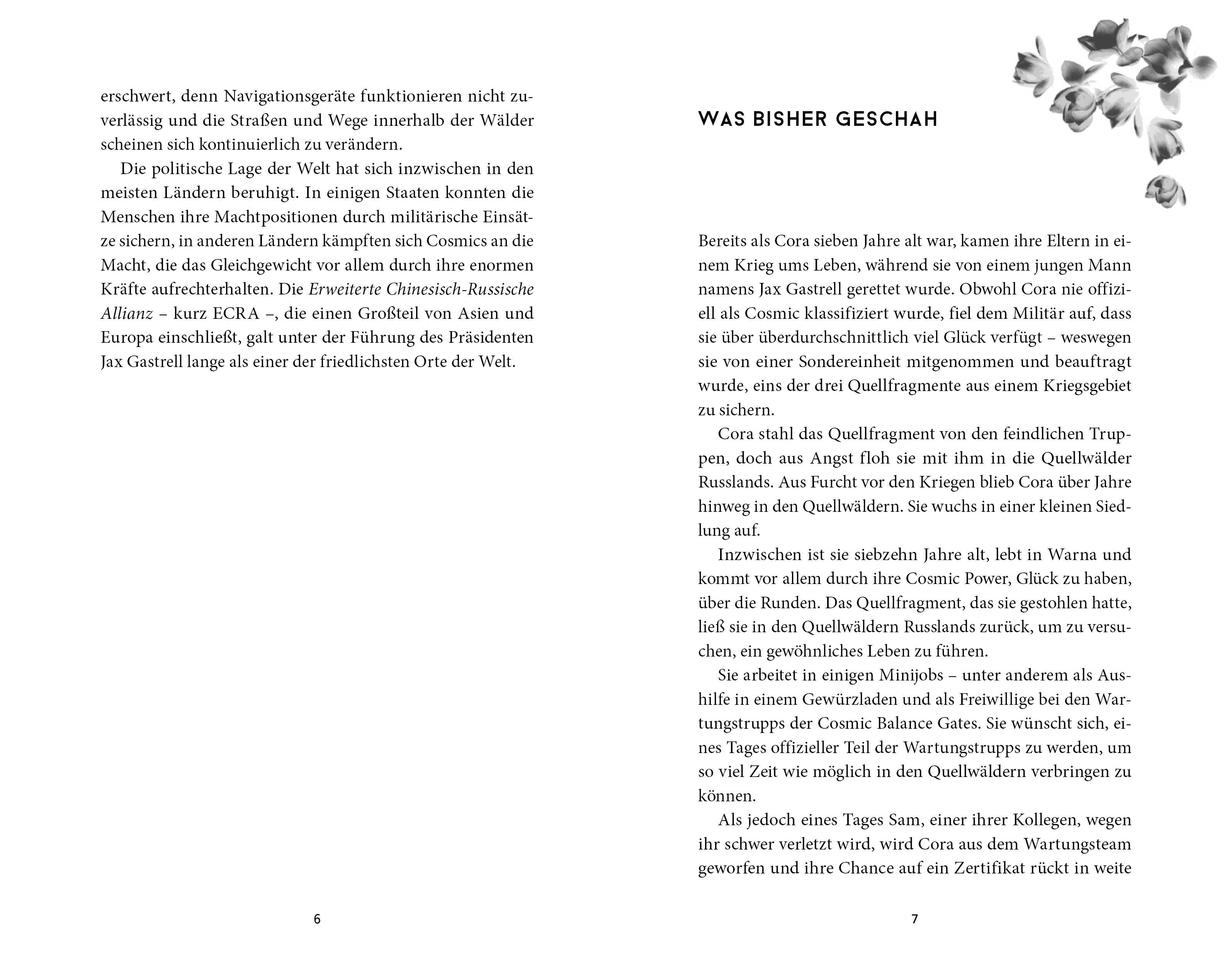 Cora und King haben bewiesen, dass sie die mächtigsten Studentinnen an der Academy of Cosmic Power sind, doch ihnen ist kein Durchatmen vergönnt. Es droht, ein Krieg zwischen Cosmics und Menschen auszubrechen und der Politiker Jax, der einst Coras Leben gerettet hat, steckt dahinter. Die Spur führt nach Berlin, wo sich eines der Quellfragmente befinden soll – doch als Cora, King und ihre Freunde dort ankommen, ist es nicht mehr da. Längst hat es Jax an sich genommen und plant einen größenwahnsinnigen Coup, der das Ende der Menschheit zur Folge haben könnte. Ein Kampf beginnt, der Verluste fordert und die Liebe von Cora und King auf eine harte Probe stellt.