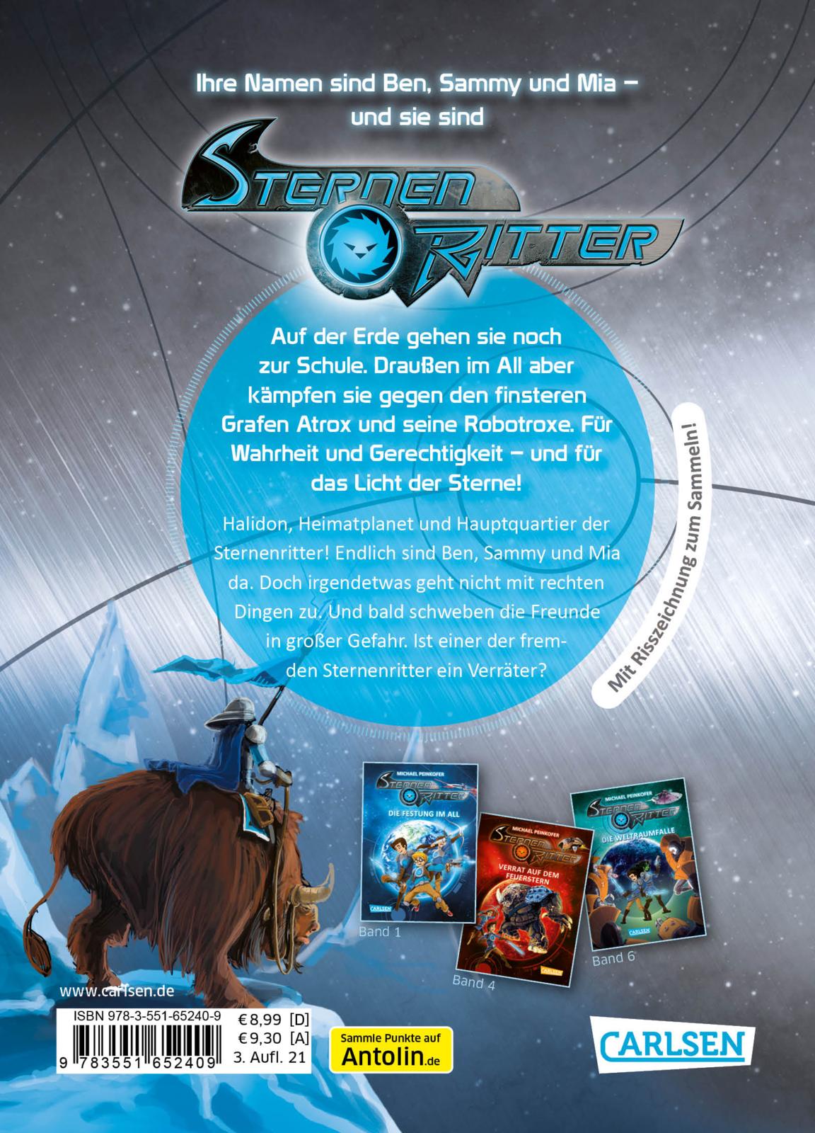 - Beschreibung Ihren Schulstress vergessen Ben, Sammy und Mia bei ihren galaktischen Abenteuern als Sternenritter. Über 160.000 kleine und große Leser sind schon mitgeflogen. Zu Hause auf der Erde denkt jeder, die drei wären ganz normale Schüler. Aber draußen im All kämpfen Ben, Sammy und Mia gegen den finsteren Grafen Atrox und seine Robotroxe. BAND 10: Halidon, Heimatplanet und Hauptquartier der Sternenritter! Endlich sind Ben, Sammy und Mia da. Doch irgendetwas geht nicht mit rechten Dingen zu. Und bald schweben die Freunde in großer Gefahr: Ist einer der fremden Sternenritter ein Verräter? Für Star Wars-Fans ab 8 Jahren: Voll spannender Action, Freundschaft und AbenteuerSternenritter ist eine fantasievolle Serie für junge Science Fiction- und Star-Wars-Fans mit vielen Bildern, kurzen Kapiteln, warmherzig erzählt – das perfekte "erste richtige Buch" für Leseanfänger. Vom Bestsellerautor Michael Peinkofer – mit Raumschiffzeichnungen zum Sammeln in jedem Band! "Unser 10-jähriger Sohn liebt Sternenritter! Ich kann gar nicht so schnell nachkaufen, wie er sie liest. Darüber ist er sogar generell ans Lesen gekommen. " (Elternstimme) Altersempfehlung: ab 8 Jahre