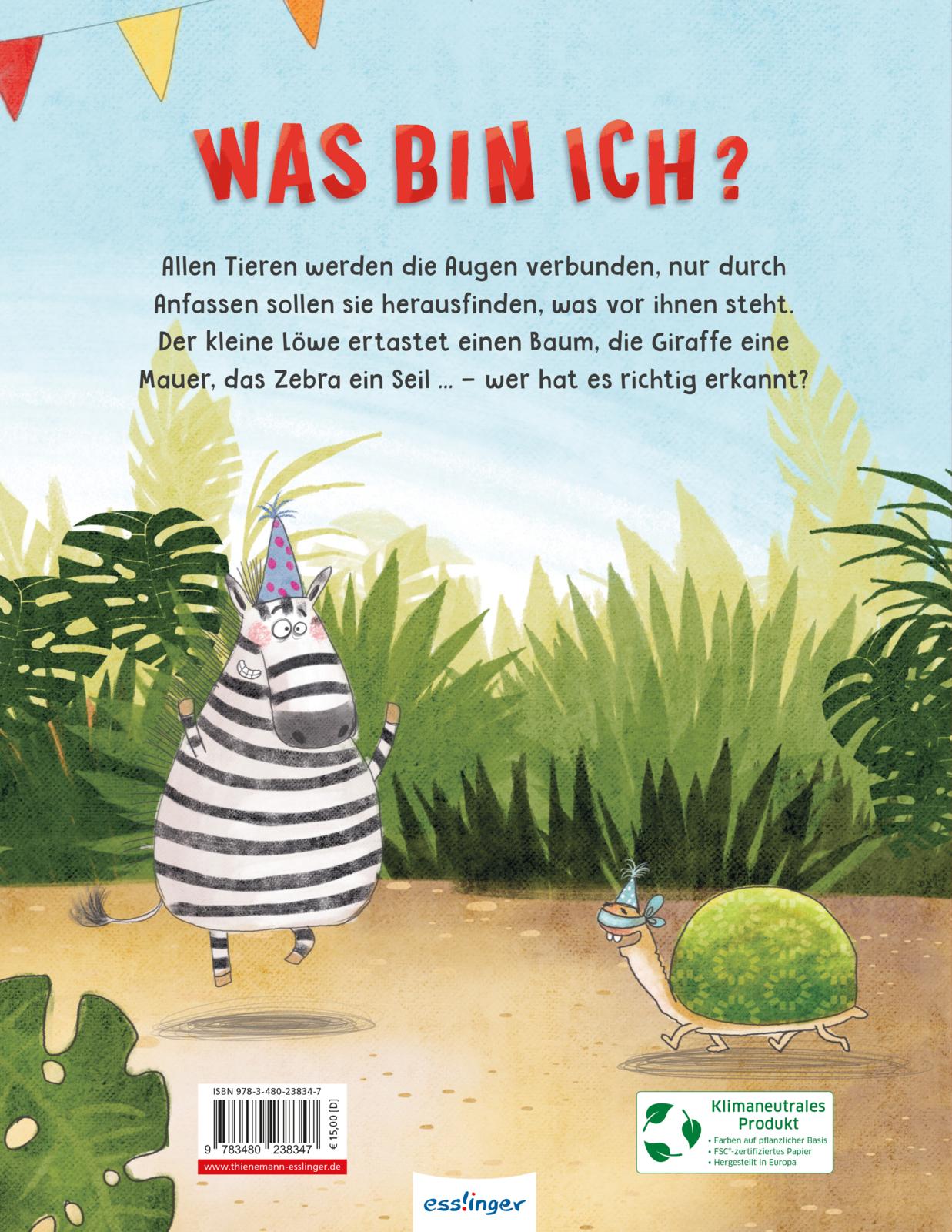 Geburtstagsparty beim kleinen Löwen. Mama und Papa Löwe haben ein tolles Spiel vorbereitet. „Was bin ich?“ wird gefragt: Allen Tieren werden die Augen verbunden, nur durch Anfassen sollen sie herausfinden, was vor ihnen steht. Der kleine Löwe ertastet einen Baum, die Giraffe eine Mauer, das Nilpferd eine Schlange, das Krokodil einen Fächer, das Zebra ein Seil … – wer hat es richtig erkannt?